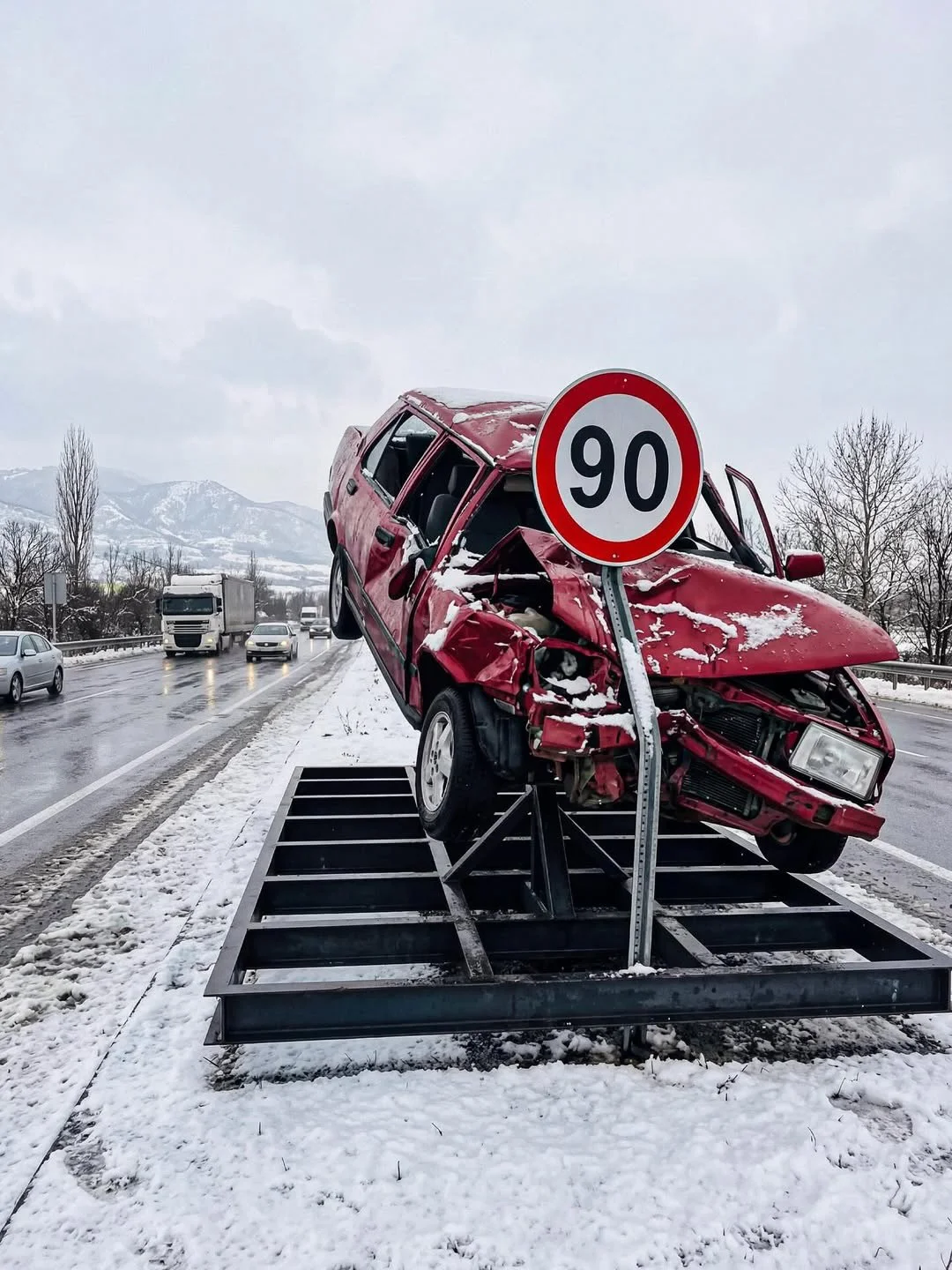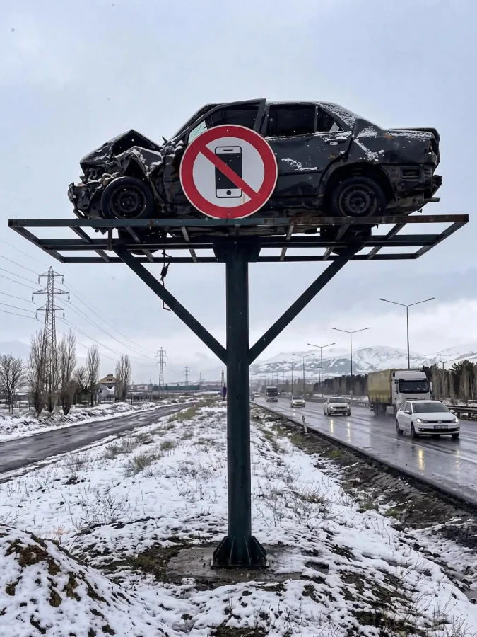 На дорогах Турции можно увидеть необычное и даже пугающее зрелище: над трассами и на обочинах установлены настоящие автомобили, разбитые в реальных ДТП. Вместо привычных рекламных щитов — искореженные кузова, смятые двери и погнутые капоты, а рядом хорошо заметные дорожные знаки с ограничением скорости или запретом пользоваться телефоном за рулём.