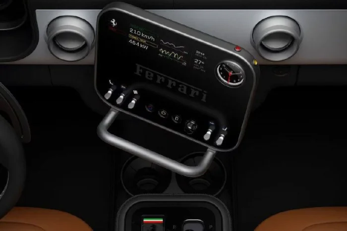 Салон батарейной Ferrari разработал бывший дизайнер Apple Джони Айв, прославившийся созданием iPhone, поэтому интерьер изобилует стеклянными и алюминиевыми элементами.