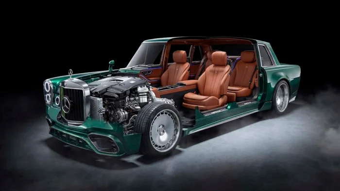 Выбор пал именно на эту модель не случайно. Колёсная база W100 практически совпадает с актуальным кузовом V223, что позволило установить классический кузов на современное шасси с адаптивной подвеской и гибридной силовой установкой. В результате под капотом оказался 4-литровый битурбо V8 в связке с электромотором, суммарно выдающий свыше 800 лошадиных сил.