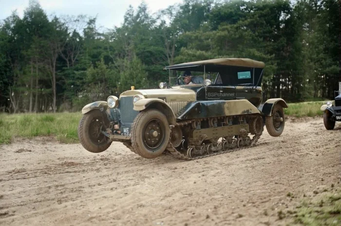 Участники конференции по колониальному управлению наблюдают в Олдершот демонстрацию вездеходной техники, организованную Военным ведомством. Во время движения по обычной дороге гусеницы машины поднимались вверх.