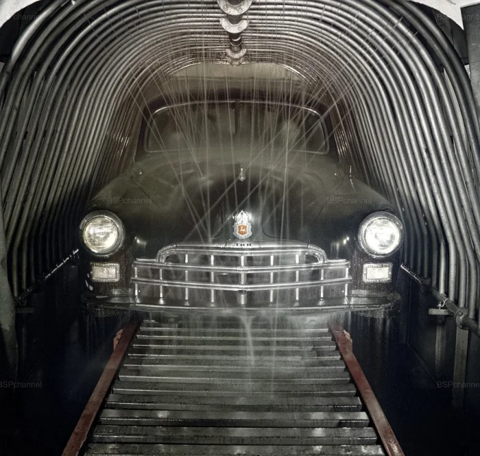 Испытание кузова автомобиля "ЗИМ" на герметичность на Горьковском автомобильном заводе имени В.М. Молотова. Горький, 1955 год.