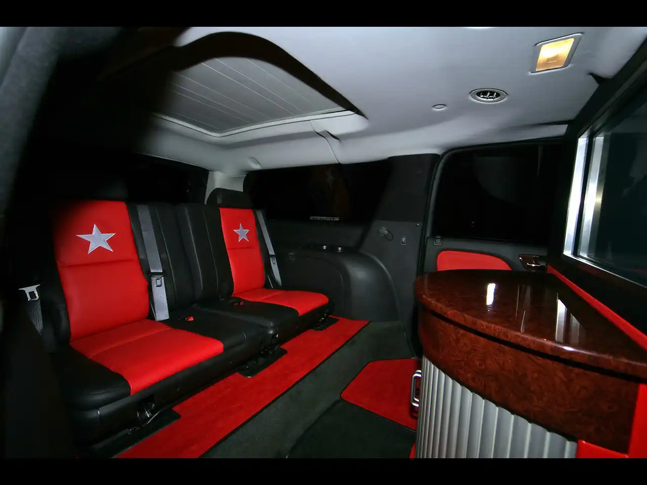 The interior also features an especially exclusive design: The red and black leather seats with STAR FORCE logo are custom-made by GeigerCars.de as is the rear partition wall with retractable glass pane. A Toshiba LCD projector can beam the images of either digital TV broadcasts or a DVD onto the glass pane coated with a special holographic projection surface foil. The accompanying sound comes from a Hi-Fi system with more than 1,000 watts of power and loudspeakers and subwoofer custom-calibrated to the Escalade’s interior.
