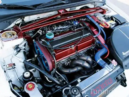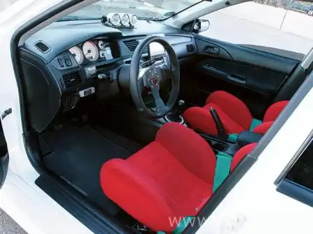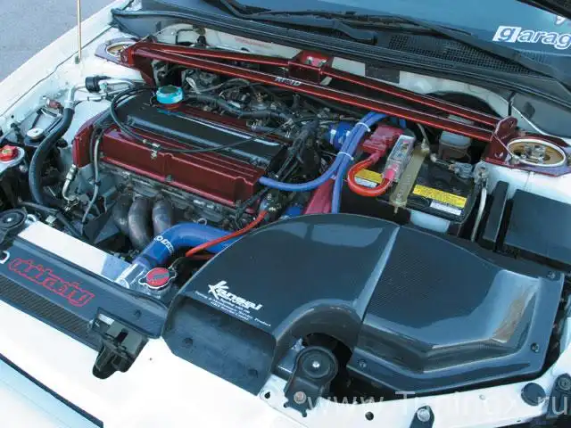 На нем есть кое-какие хитрые штучки, некоторые из них - оригинальные JDM. Наибольший интерес вызывает хитрая карбоновая система подачи воздуха HKS Kansai Service. Модуль Kansai очень похож на заводской воздух, но у него увеличенное впускное отверстие, а подача воздуха производится по более прямому пути. На впускной системе Kansai установлены более производительные фильтры от RMR. Большой интеркулер Perrin воздух-воздух заменил заводской интеркулер, а воздух подается по трубопроводу Ralliart. Большой интеркулер переднего расположения выгодно подчеркивается боди-китом C-West.