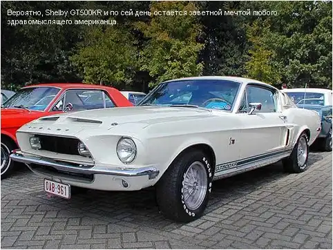 В 1968 году с фордовского конвейера в Ионии, штат Мичиган, сошёл первый Shelby GT500KR. Буквы KR в названии прописались не просто так. Это сокращение от словосочетания «King of the Road» — «король дороги». Тогда же на передних крыльях и в салоне появились эмблемы кобры, за что автомобиль и получил своё второе имя — Cobra GT500KR. Чтобы владельцы могли сэкономить на страховке, производитель указывал в характеристиках мощность в 335 л.с., в то время как реальная отдача от V-образной «восьмёрки» была около 400 лошадей.