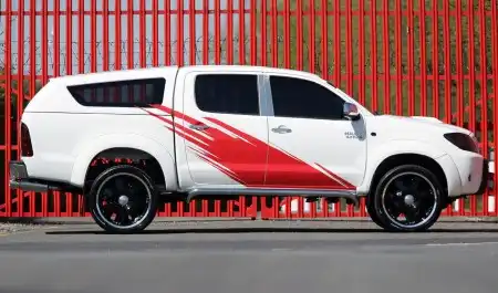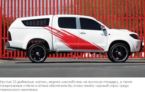 Так что Toyota, представленная на выставке Commercial Vehicle Show 2007, которая проходит в английском Бирмингеме, и вовсе оказалась пикапом! И его постарались как следует «причесать» под формульный болид — та же ярко-белая окраска с броским красным росчерком на борту, да и колёса явно не утилитарно-внедорожные.