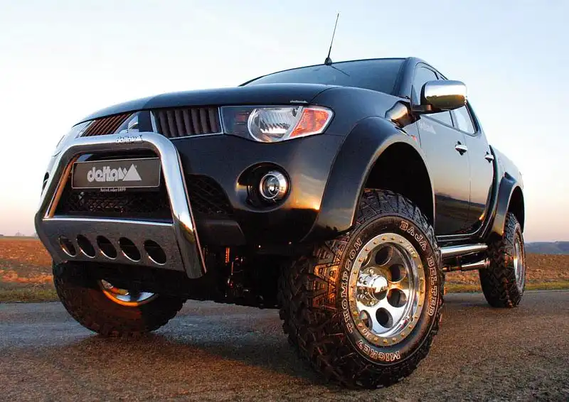 Баварский эксперт в области накачки автомобильных мускулов, компания Delta4x4, показала свой мощный дуэт в рамках недавнего Tuning World Bodensee 2007 в немецком Фридрихсхафене (Friedrichshafen). Свой высокий рост Nissan Navara и Mitsubishi L200 получили за счет пакета деталей подвески и новых колес с мощными внедорожными шинами. Для Nissan Navara были выбраны “зубастые” покрышки Mickey Thompson ATZ размерности 325/50-20, а для Mitsubishi подошли шины Pirelli 305/50-20. Мощный торс автомобилей получен благодаря установке обвеса из стальных труб водопроводного диаметра. У обеих машин есть мощный кенгурятник и не менее мощные трубы, выполняющие роль боковой защиты кузова.