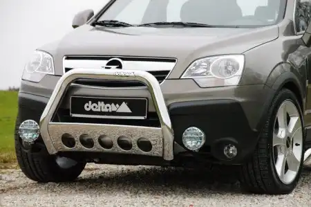 Вместе с двумя брутальными пикапами на той же тюнинговой выставке Delta4x4 представила и более интеллигентный автомобиль. Тонкий спортивный стиль Opel Antara не удалось полностью искоренить даже стальными трубами с большими колесами. Antara от Delta4x4 оснащена изящным обвесом из нержавеющей стали под названием “Delta s-tec”, передними дополнительными противотуманными фарами PIAA-Rallye 540, спортивной выхлопной системой высокой эффективности, новыми литыми колесами в 20 дюймов и шинами от Vredestein. Паркетник Antara в результате остался паркетником, хотя и с модными наворотами.