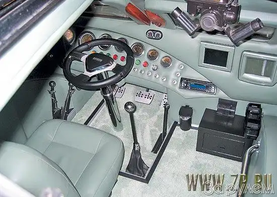 Хотя круги вокруг машины можно нарезать до позднего вечера, пора отправляться на экскурсию в кабину. Для этого около машины стоит специально сооруженная стремянка, а на правом борту установлена хромированная лесенка. Дерзкие попытки проникнуть в кабину как есть Михаил сразу пресекает. Нужно убрать металлические предметы, снять обувь и надеть на ноги полиэтиленовые бахилы (такие же выдают посетителям в центре микрохирургии глаза Святослава Федорова). Респиратор разрешается не надевать... Обалдеть можно! Мы уже подзабыли, как удивились, только шагнув в гараж. Он чище, чем у иных санузел, – раз. Два – ворота занавешены полиэтиленовым пологом. Три – сама машина (больша-а-ая машина) заботливо укутана в полиэтиленовый же чехол, прихваченный к корпусу малярным скотчем. Наш провожатый, взявшийся снимать пленку, был мгновенно отстранен от этого дела. Михаил ловко снял «тент» и сообщил, что заменит его на новый – хотя полиэтилен был целехонек!