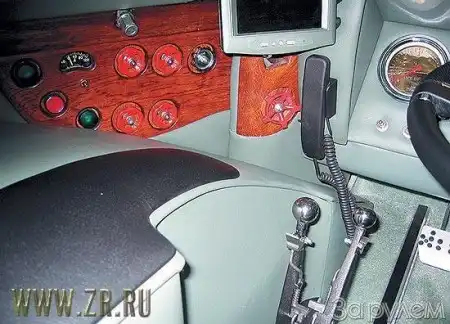 Пролезть с фотоаппаратом через верхний люк не так просто, как кажется «с земли», – пришлось сесть на броню, крутануться и опуститься в кабину, осторожно ступая. И тут приходит очередная волна странного «долгоиграющего» шока. Шестиместная кабина по-яхтенному роскошна – отделана дорогой, приятнейшей на ощупь кожей «валютного» цвета, ковровым покрытием такого же оттенка, панелями из лакированного африканского дуба.