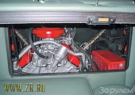 Добравшись до моторного отсека, мы, само собой, не оставили без осмотра двигатель. Заметно, что мастера поработали и над ним: он качественно окрашен, нет и намека на подтеки, все шланги забраны в металлическую оплетку, как на спортивных автомобилях.