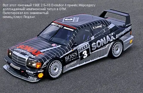 Обвес 190E 2.5–16 Evolution II оказался не только эффектным, но и очень эффективным. Показатель «0,29» в графе «Коэффициент сопротивления воздуха» — весьма хороший результат и для нынешних автомобилей, а тогда он произвёл настоящий фурор. Пришлось BMW выполнять обещание. А спустя два года пилот команды AMG Racing Клаус Людвиг (Klaus Ludwig) порадовал боссов трёхлучевой звезды, завоевав долгожданный титул в чемпионате DTM. То было время расцвета гоночных 190-х — форсированные свыше 300 сил моторы и сниженная до тонны масса позволяли им достигать впечатляющей скорости — 300 км/ч.