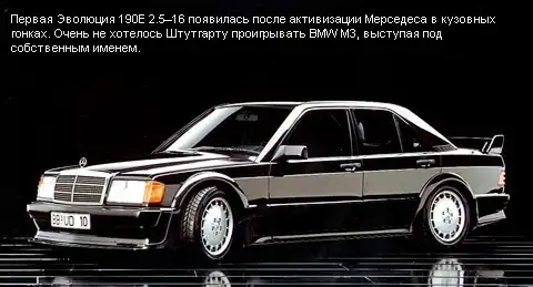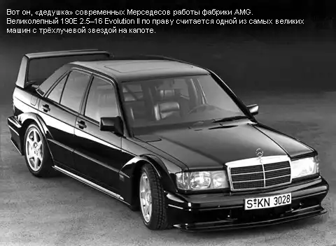 А началось всё в далёкие 70-е, когда Mercedes-Benz довольно успешно участвовал в ралли. С появлением 190-й модели в Штутгарте решили продолжить гоночные традиции и обратились к известной фирме Cosworth. Англичане помогли немцам с мотором — 2,3-литровая 16-клапанная «четвёрка» в гоночной спецификации выдавала вполне приличные 320 «лошадок».