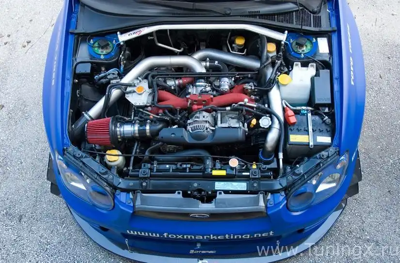 низ WORX Tuning Race, STI crank, увеличенные маслосъемники, рулевые тяги STI, юбки поршня Molly, балансировка двигателя 10000 об/мин, DPR Racing Rally Stage 3 головки и кулачки: полированные головки цилиндров, полный визуальный осмотр, проверка всех поверхностей на надежность, проверка клапанных механизмов на износ, проверка и очистка пружин, полировка корпуса, ручная установка и вакуумная проверка седел клапанов, очистка и полировка пространства за седлами клапанов, камеры сгорания CC, очистка и полировка камер сгорания, клапаны Competition, гнезда Radiused Blend, ручная установка и вакуумная очистка гнезд клапанов, увеличенные гнезда клапанов ISD, очистка головок цилиндра, подобранный по размеру впускной коллектор, подобранный по размеру корпус дроссельных заслонок, сбалансированный размер камеры, пружины DPR, клапаны SS DPR, держатели DPR Titanium, эксцентрики DPR Stage 3 (272 впуск/выпуск), турбокит GT35R WORX Tuning: Garrett GT35R Dual Ball-Bearing Turbo, внешний регулятор давления наддува 38 мм Tial, Rotated Turbo Design, напорная труба турбины, распределительная труба, коллектор GT SPEC 4-1, синтетическое моторное масло Kendall GT-1 10w-30, передний интеркулер WORX Tuning, колпачок масленки WORX Tuning, крепление аккумулятора WORX Tuning, укороченная силовая система впуска воздуха WORX Tuning, входной фильтр Fujita, выхлопная система из углеродного волокна HKS Titanium, контроллер наддува Perrin Manuel, облегченные ролики Unorthodox, распылитель интеркулера Nitrous Express