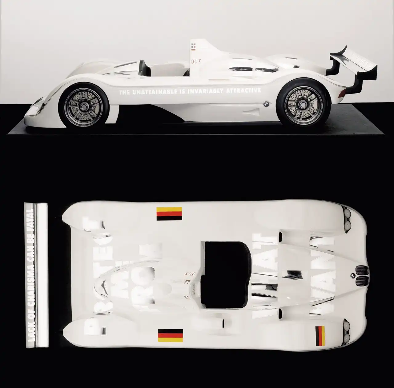 Гоночный BMW V12 LMR благодаря 580-сильному мотору набирал максимальную скорость в 340 км/ч. Оформлен автомобиль одной из самых востребованных художниц наших дней американкой Дженни Хольцер (Jenny Holzer). Чтобы голубой и белый цвета незатейливой композиции оставались видны на протяжении всей 24-часовой гонки в Ле-Мане, она использовала светоотражающие и фосфоресцирующие краски.