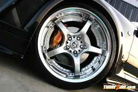 Диски Volk Racing 19x10" с резиной Yokahama S-03, 8-поршневые передние суппорты Rotora с 405-миллиметровыми перфорированными тормозными дисками, 4-поршневые задние тормозные суппорты Rotora с 355-миллиметровыми перфорированными тормозными дисками.
