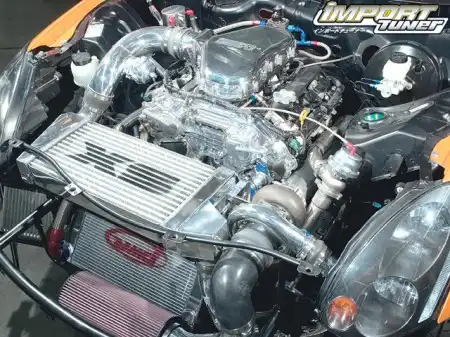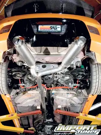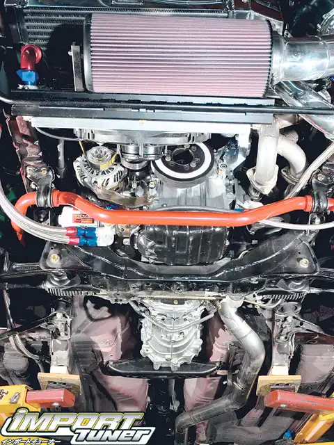 Вскоре прибыл турбочарджер T04 X2 от XS Engineering и началась работа по его установке. K&N изготовили выпускной коллектор. Воздух в системе проходит через интеркулер от XS Engineering с трубами, изготовленными K&N. 44-миллиметровый внешний вестгейт от Tial регулирует давление наддува, а предохранительный клапан от Tial выбрасывает воздух во впуск. Во время нашей фотосессии VQ35 дышал через систему впуска Typhoon, однако на трек G35 выйдет с карбоновой коробкой, воздух в которую будет поступать прямиком через передний бампер. Выхлопная система из нержавеющей стали с титановыми глушителями Tanabe Ultra Medallion была создана K&N только для шоу; на треке же будет использована простая система с боковым выходом.