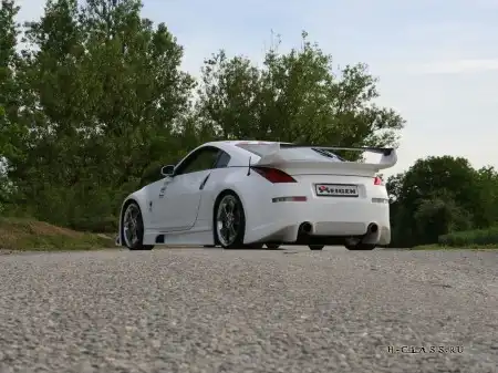 На этот раз отличились "тюнеры" компании Xeigen и выкатили из своих ворот невероятно агрессивный Nissan 350Z. Ниссановский "Зорро" никогда не был пай-мальчиком, а тут и вовсе превратился в воплощение зла, словно сбежавшее с трассы японского кузовного чемпионата JGTC!В первую очередь стоит отметить экстремальный аэродинамический обвес, названный Formula. Он состоит из полностью оригинальных деталей, заменяющих стандартные ниссановские. Он состоит из переднего бампера с углепластиковым "лезвием" спойлера, профилированных накладок на пороги, заднего бампера с некоторым подобием диффузора и гипертрофированное заднее крыло с углепластиковой активной плоскостью. Обвес Xeigen Formula роднит "стандартный" 350Z с его гоночным "братцем", очень успешным болидом JGTC.Свою лепту в копилку великолепного внешнего вида вносит спортивная подвеска KW, уменьшившая клиренс на 40 мм. И теперь Nissan 350Z Xeigen Formula, буквально лежит на дороге из-за абсурдно малого дорожного просвета, куда органичнее смотрелся бы на гоночной трассе, нежели на фоне романтической и тихой идиллии швейцарской природы. Ну а чтобы уничтожить малейшие сомнения в способностях машины, швейцарцы из Xeigen нанесли на крышу рисунок в виде флага камикадзе! Да, такому лучше уступить дорогу..."Швейцарский камикадзе" щеголяет роскошной "обувкой" - крутыми 20-дюймовыми хромированными дисками Parotech на сверхнизкопрофильной резине Pirelli размерности 245/30 ZR20! В сочетании с агрессивным обвесом и пониженным клиренсом они смотрятся просто потрясающе! А вот деталь, совершенно несвойственная камикадзе, - мощные тормоза Brembo были слегка доработаны, ведь мощность 3.5-литровой "шестерки" была повышена на 30 лошадиных сил и превысила заветную отметку в 300 сил (двигатель стал выдавать 310 сил ).Надо признать, что у тюнеров из Xeigen получился очень гармоничный автомобиль. Красивы не только его детали по отдельности, красив он и в целом, в своей брутальной агрессивности. Но и этого мало неугомонным швейцарцам! Уже запланирована вторая генерация комплекта Formula, которая обещает стать еще "злее"! Камикадзе возвращаются?