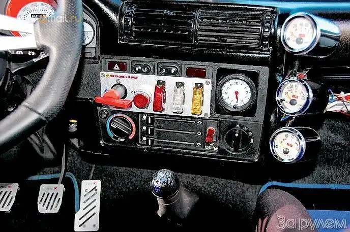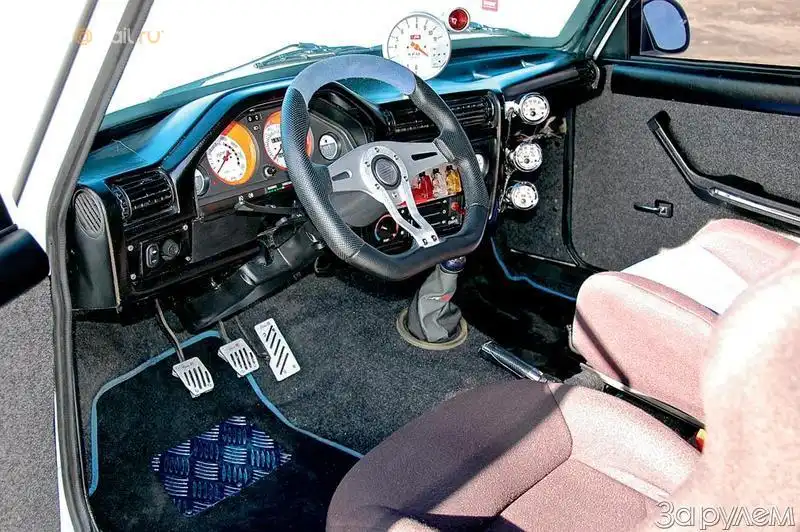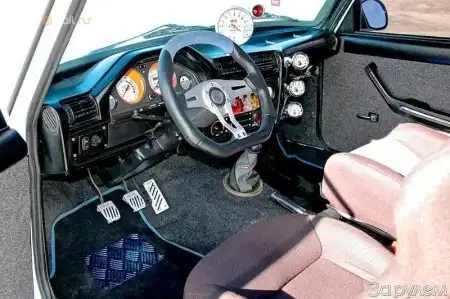 В салоне очень удачно прописалась панель от БМВ, нашпигованная приборами от вазовской «шестерки». Дополнительные циферблаты теперь уже стали нормой для тюнинговых авто: огромный тахометр, указатели давления масла, температуры охлаждающей жидкости и вольтметр. Право, без них можно и обойтись. А вот спортивные сиденья в самый раз. Пассажир довольствуется креслом UNP, водитель тем более не обижен: он размещается в итальянском ковше «Moмo».