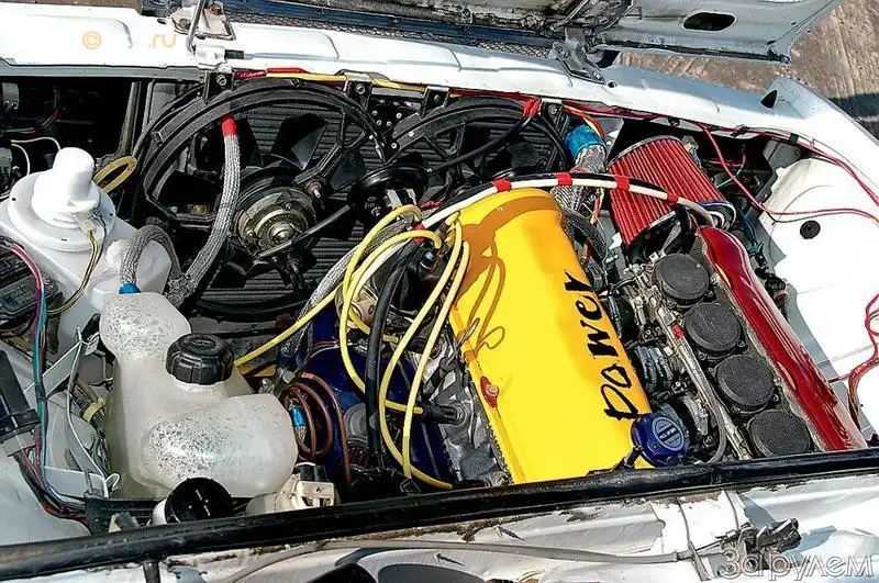 Смесеобразованием заведуют четыре (!) мотоциклетных карбюратора, объединенные общим самодельным ресивером с фильтром нулевого сопротивления «Про Спорт». Система зажигания, как ни парадоксально, осталась контактно-транзисторной – с доработанным распределителем «Нивы», катушкой зажигания ВАЗ-2108 и коммутатором от «Ауди-100». Выпускной коллектор по схеме 4-2-1 продолжен трактом диаметром 53 мм, в котором установлены резонатор «Ремус» и глушитель «Эф-Би-Тюнинг».