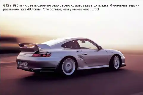 Porsche 911 с гипертрофированным антикрылом и шильдиком GT2 появился в модельном ряду для омологации гоночного варианта «911-го». Первые версии развивали 430 «лошадок», а после модернизации из турбомотора выжали уже все 450.