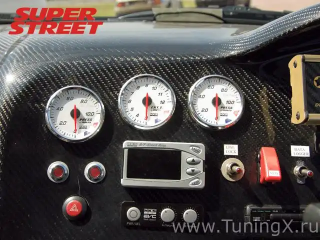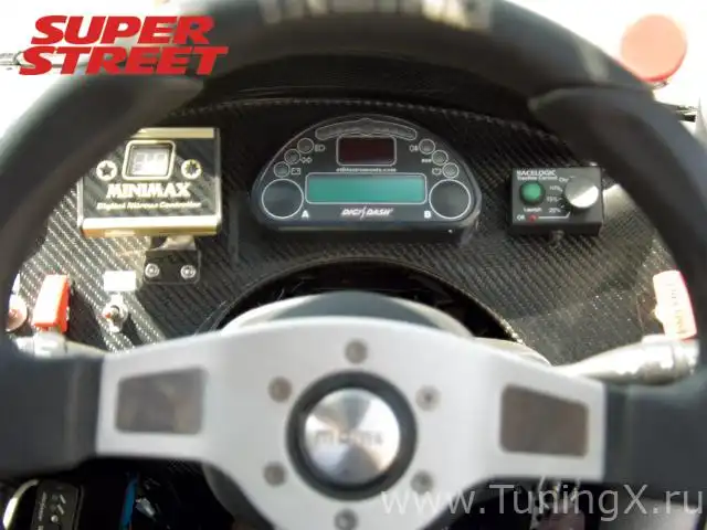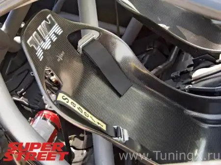 Внутри: каркас GT-Art; карбоновые кресла; ремни Sabelt; пропитанная смолой карбоновая панель приборов с цифровым дисплеем и дата-логгером; система launch/traction control от Race Logic; рулевое колесо, ручник и ручка КПП MOMO; огнетушитель.