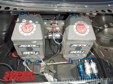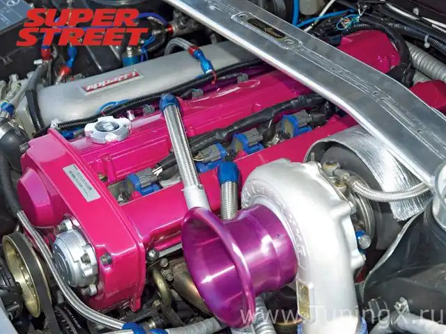 Под капотом: 24-клапанный RB25 (расточен до объема 2650cc, отполирован и сбалансирован); опоры двигателя Nismo; головка цилиндров Drag Flow; набор поршней JUN Super; набор шатунов, распредвалы, масляный насос JUN Super; набор болтов для головки блока цилиндров JUN Racing, набор шпилек JUN Racing; турбина HKS T51 SPLBB, модифицированный коллектор к ней, вестгейт, интеркулер, прокладка головки цилиндров, инжекторы на 1200cc, топливная рейка, датчики детонации; блок резисторов инжекторов от GT-R, проводка для инжекторов, бачок маслоуловителя GT-Art, масляный поддон, водяной насос, дифференциал и топливный кулер Mocal; воздухозаборник, очень большой блок дроссельной заслонки, масляный кулер, крепления труб водяного насоса, корпус термостата – все GReddy; радиатор Race Spec; различные детали с керамическим покрытием; система закиси азота директ-порт Wizards of NOS (прибавка более 200 л.с.); набор патрубков Goodridge; топливные баки, датчики топлива, двойной топливный насос, индивидуальная выпускная система – все ATL.