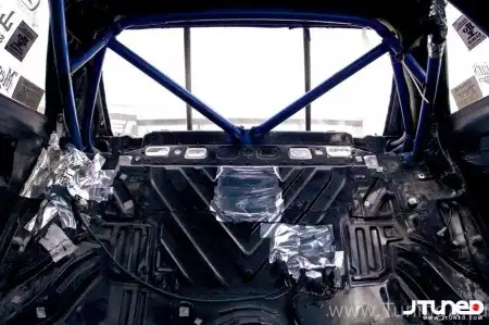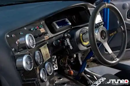 В изрядно разграбленном салоне оказалось достаточно места для модифицированного каркаса безопасности Cusco и коробки для датчиков, сделанной из карбона. Мягкие удобные сиденья переднего и заднего ряда давным-давно выкинуты отсюда и заменены сертифицированным FIA ковшом Sparco для водителя и складывающимся креслом Bride для того, кому посчастливится побыть пулеметчиком, то есть, простите, пассажиром.