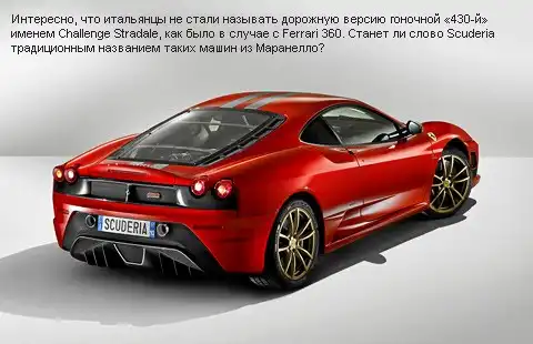 Несомненно, к числу таких относится и самая, пожалуй, знаковая модификация Ferrari F430 — Scuderia. Итальянцы подчёркивают, что для её создания использованы решения, проверенные в Формуле-1. По технической «начинке» машина максимально приближена к гоночной Challenge, но лишена каркаса безопасности, пневматических домкратов и имеет полноценные, а не облегчённые, стёкла. Поэтому и снаряжённая масса чуточку возросла — Scuderia весит 1250 килограммов, что на 25 больше, чем у экстремальной «копии».