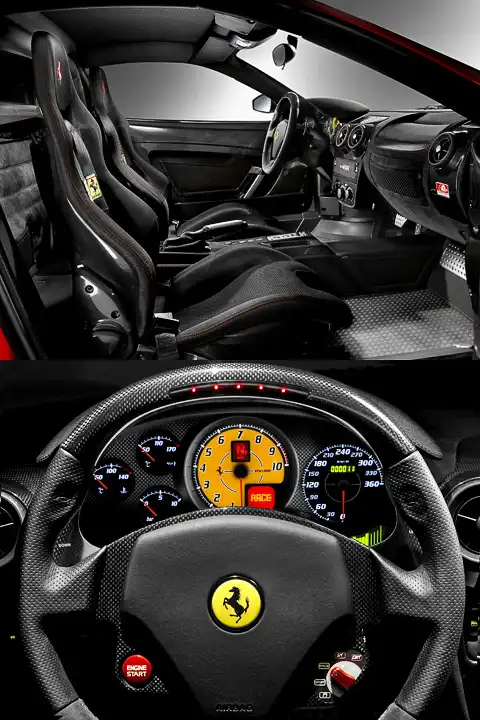 Интерьер Ferrari F430 Scuderia — царство карбона, алюминия и специальной ткани. Инженеры приложили немало усилий, чтобы сделать суперкар предельно лёгким. Число 10 на тахометре отражает бешеный характер машины — максимальная мощность достигается на 8500 об/мин.