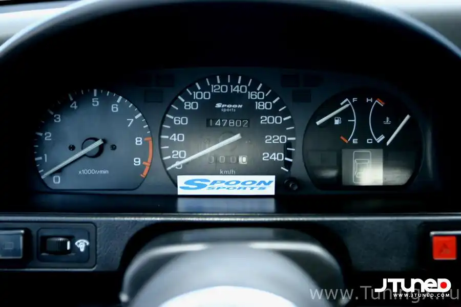 В салоне вы не обнаружите переделки на правый руль. Возможно, это единственный недочет в мании установить сюда все японское. На самом деле Чарльзу это не нужно. Без изменений, конечно, не обошлось – кресла с японского SiR заменили стандартные, а водителю достался карбоновый ковш. Еще один образец продукции Circuit Hero – это проставка ступицы рулевого колеса, а сам руль – это Mugen SW-36. Приборный щиток взят с SiR, хотя спидометр был убран в пользу аналога от Spoon Sports. Еще Чарльз заменил центральную консоль на консоль от CR-X – у нее более эргономичный дизайн, и она немного отличается от стандартной консоли Цивика, внося индивидуальность в интерьер.