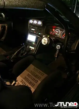 В салоне почти все оформлено материалами с логотипом Bride. Передние кресла Bride Ergo 1 O.G. и каркас ADF защищают тех, кто сидит внутри. Стандартные приборы заменены на продукцию Nismo, а подмоторная рама и опорные балки Do-Luck добавляют кузову жесткости.