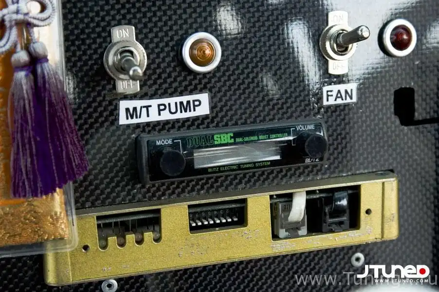 В салоне вы увидите гоночное сиденье водителя Bride Zeta II, переключатели и измерительные приборы Signal Auto, руль Rays и карбоновые панели. Все остальное удалено.