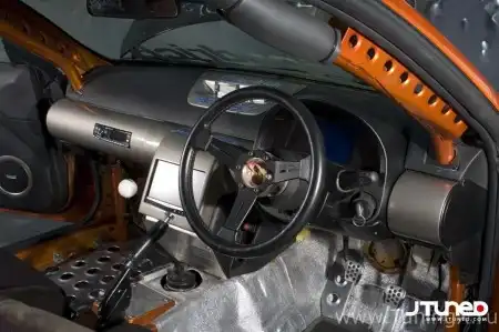 Водитель и пассажир комфортно размещаются в сиденьях-"ковшах" производства Signal. Max Racing F-Con Special Display, рычаг трансмиссии Signal, руль Nardi Classic и два головных устройства Alpine – вот обновки в кабине, а все остальное здесь теперь выкрашено в оранжевый цвет.