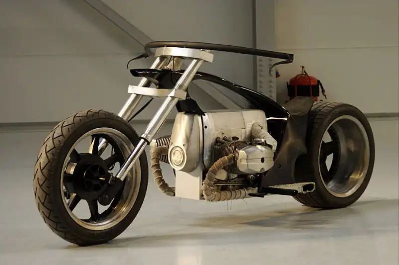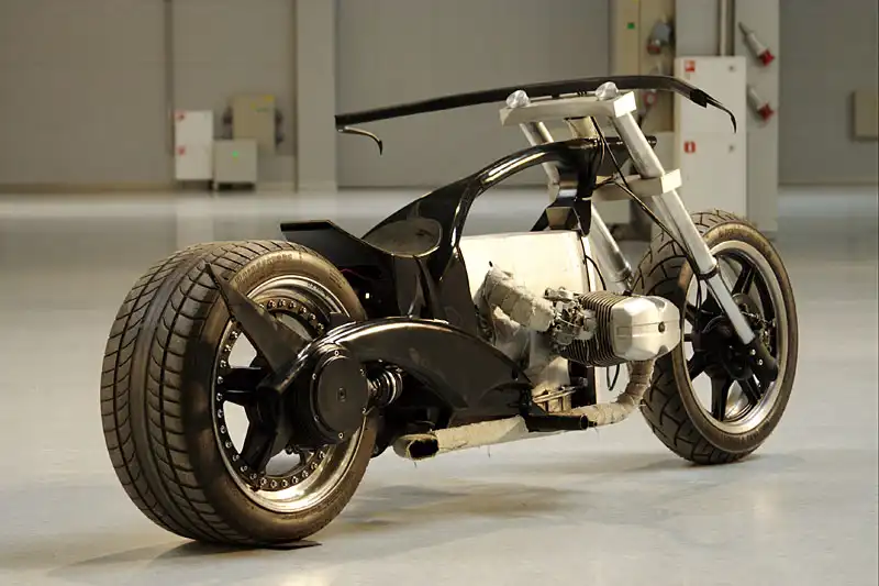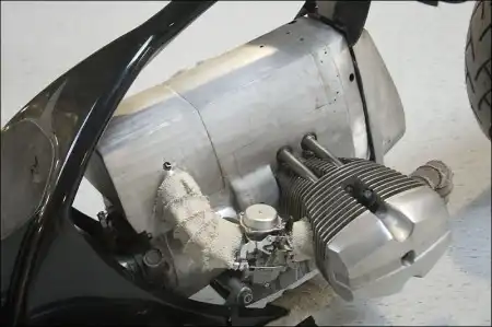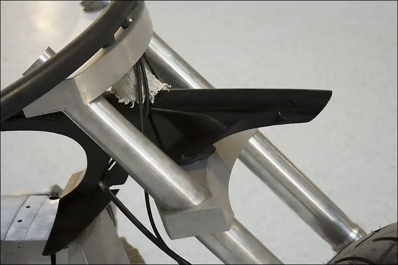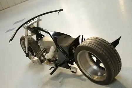 Двигатель представлял кусок алюминия - квадратного алюминия и при полировке он может превратиться во что-то круглое - зализанное, что сразу нарушит весь дизайн. Ему нужно придать еще больше матовых линий, взяли наждачку №40 и горизонтально нанесли их на него. Для выдержки стиля большая часть деталей должна быть в алюминии, но друг от друга отделена железом - крашеным железом НИКАКОГО ХРОМА! Из того что было на полках прорисовалась следующая картина: переднее колесо METZELER 140/70 плюс алюминиевый сварной обод из двух ижевских задних колес (орионовские)4.8x18''на зад замечательно вписалось колесо O.Z.Racing от гоночного авто; BRIDGESTONE 245/40 обод 9x17''.Для насыщенности алюминия применили вилку перевернутого типа SHOWA кроссового мото и изготовили траверсы из листового алюминия. Все алюминиевое отдали на растерзание наждачке №40,в том же стиле что и двигатель (грубые полосы в одном направлении).