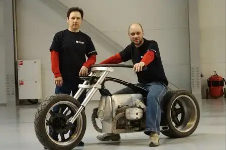 Зимой 2004-2005 неспеша начался прорабатываться проект. За дизайн и технические решение отвечал я Олег'EASY', а за воплощение тех.решений в металл Володя'МАСТЕР'.Внимание акцентировалось только на двигатель и колеса - без этого мото не поедет, а без остального легко. При виде едущего человека должно создаваться впечатление, что наездник оседлал двигатель, а не мото. Из вышесказанного вытекает, что МИНИМАЛИЗМ - диктует условия. На двигателе выбит номер 001,что означало он первый и изготовлен в районе 1975г-год моего рождения; это внесло тоже свою лепту. Не исключено, что по месяцу он близнец как и Я.справа он должен быть один а слева совсем иной, так родилось консольное крепление маятника. Внешне двигатель напоминает прямоугольник исходя из этого в проекте обязаны присутствовать прямые линии. МИНИМАЛИЗМ =КВАДРАТ, но квадрат не ездит - зародился круг. Должен круг плавно переходить в квадрат: переднее колесо округлой формы, заднее квадратной, рама - плавно переходящий круг в квадрат.