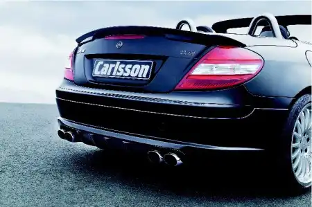 Чтобы окончательно развеять сомнения, что это – не стандартный Mercedes-Benz SLK350, устанавливается изящный аэродинамический обвес, подчеркивающий динамику и стремительность компактного родстера. Передний бампер по размерам и расстоянию до асфальта не соперничает с ножом бульдозера и не пытается придать автомобилю сходство с болидом Формулы-1, но при этом ясно дает понять, что машина не простая. Продолжают заданную тематику и мощные профилированные накладки вдоль порогов и “псевдо-диффузор” снизу заднего бампера. Небольшой спойлер на крышке багажника увеличивает прижимную силу на задней оси. Финальный аккорд – смена трехлучевой звезды на фирменные эмблемы Carlsson.