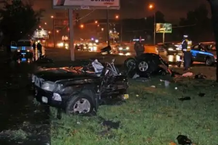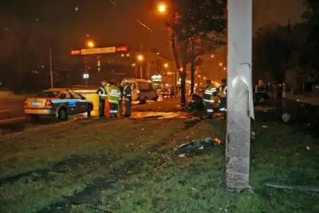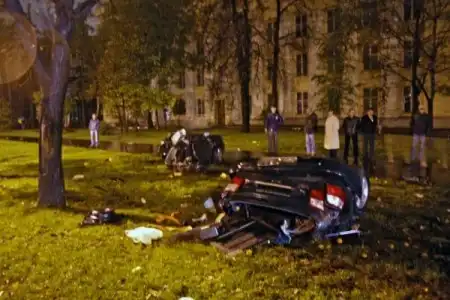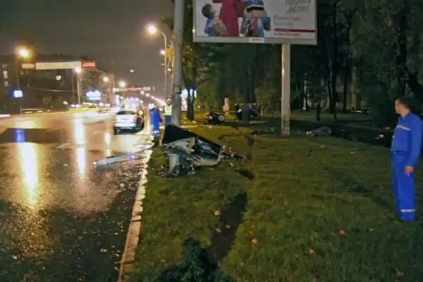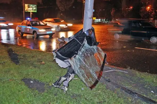 ДТП произошло на ул. Карла Бенса, задне-приводный автомобиль занесло на мокро-скользящем асфальте, не справившись с управлением, автомобиль ушёл в кювет, где, правым бортом, на скорости 100км/ч, врезался в фонарный столб.