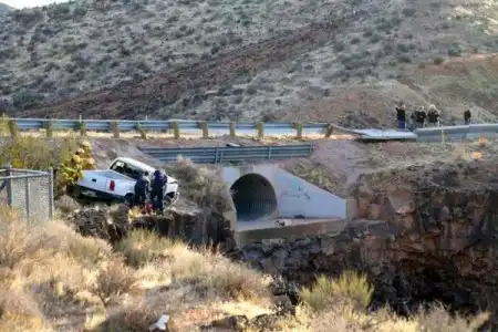 Посмотрев на фото выше, вы можете увидеть, что справа там, где стоят люди, этот парень прошиб заграждение. Пикап, ударившись о заграждение, перелетел справой стороны на левую, ударился о водосточную трубу и приземлился с левой стороны водоспуска, противоположно той стороне с которой он вылетел.