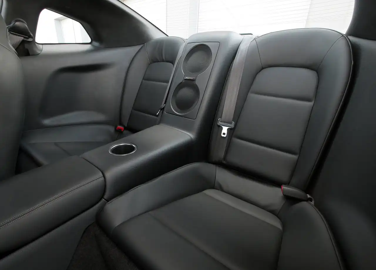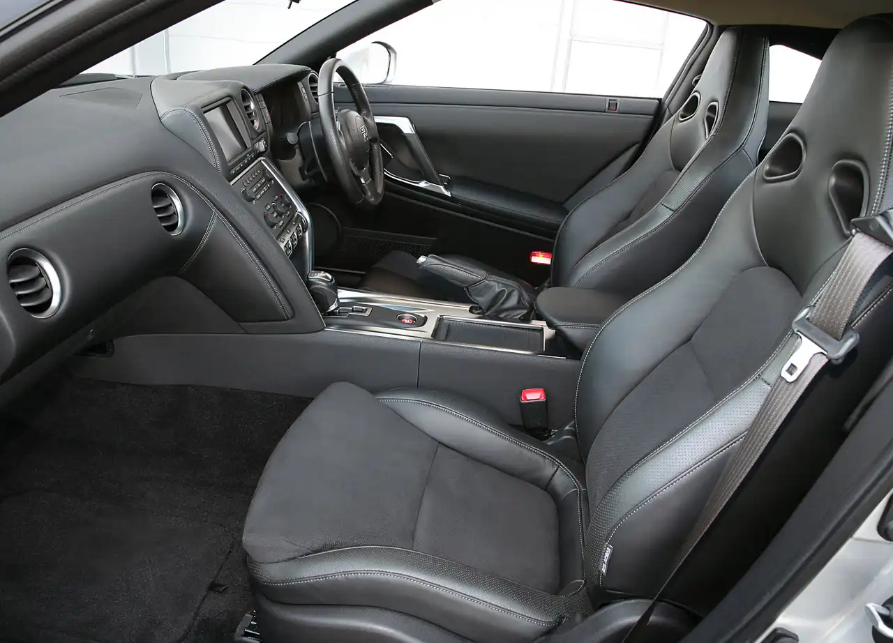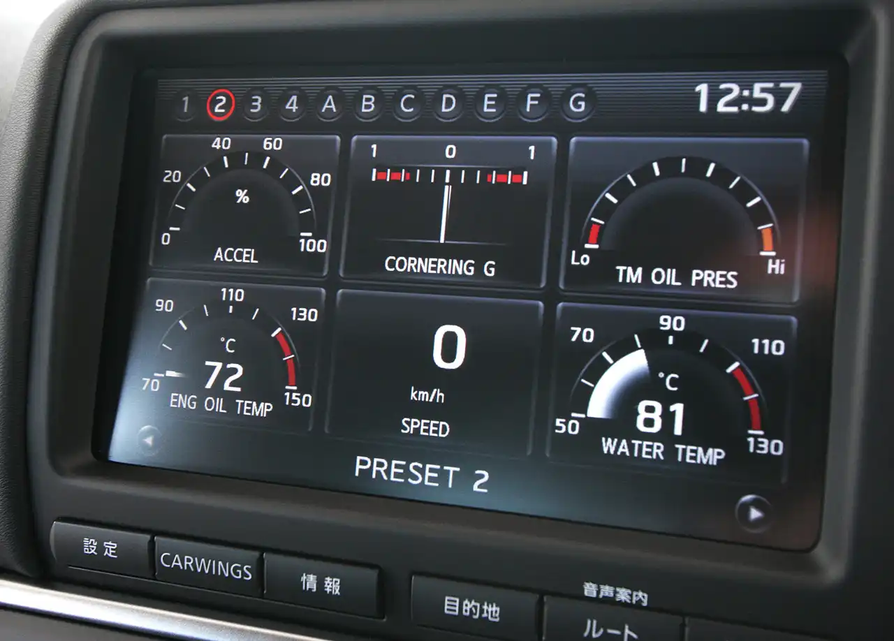 Как и в предыдущем GT-R, на дисплей можно выводить различные параметры движения вроде угла поворота колёс или уровня продольных и поперечных ускорений. А три рычажка на центральной консоли управляют работой трансмиссии, амортизаторов и системы стабилизации (режимы Normal, Comfort и R).