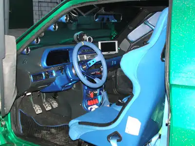 Первое, что хочется отметить в «Крокодиле», а именно такое название получила 99 после перерождения, так это его кузов, потому как он теперь стал купе. Не надо быть жестяных дел мастером или тем более конструктором, дабы понять – сделать из седана купе, это вам, как минимум, не в тапки гадить. Даже у всемогущих концернов на размножение кузовов одной модели уходят годы разработки, а потому всегда приятно видеть как наши ребята справляются с тем же, с чем не всегда справляются целые команды сверхквалифицированных инженеров. Не меньшего внимания заслуживает обвес – это вам не та груда пластика которую видишь на «Девятках» каждый день по дороге на работу, это авторский, индивидуальный комплект Гладков-сервис, и согласитесь, выглядит он не хуже, чем у каких-нибудь ASMA Design. Главное, на наш взгляд, достоинство всех этих визуальных ухищрений состоит в том, что они не пытаются выгладить от природы прямоугольных, рубленных форм Lada, напротив, они подчеркивают преимущества такого стиля, его динамичность и агрессию. Ну а ламбодвери, они и есть ламбо двери, формула купе + тюнинг практически всегда завершается ими.