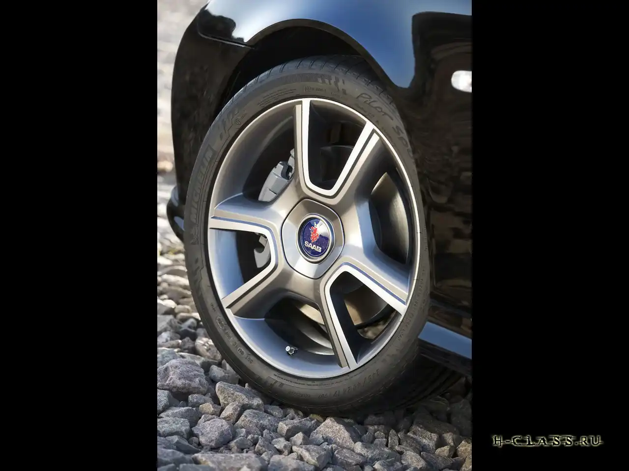 Turbo X также отличается уникальными 18-дюймовыми легкосплавными дисками (как опция доступны 19-дюймовые диски на всех рынках, кроме США/Канады) с серой, похожей на титановую отделкой, напоминающими внешний вид классических 3-спицевых дисков Saab. Двойные ромбовидные выхлопные трубы дополняют дизайн кузова. Если говорить о салоне, в нем продолжается тема ‘black turbo’. Спортивные сиденья с дополнительными ремнями обиты черной кожей. Спортивная атмосфера подчеркнута углепластиковой отделкой приборной панели, дверных вставок, перчаточного отделения и рычага переключения передач, что является уникальным для Turbo X. Водитель получает дополнительное удобство благодаря рулевому управлению с толстым ободом, отделанному мягкой кожей. Можно сделать еще один шаг вперед относительно комфорта, заказав высококлассный салон, изготовленный полностью из натуральной кожи, в который входят перфорированные подушки передних сидений и спинок.