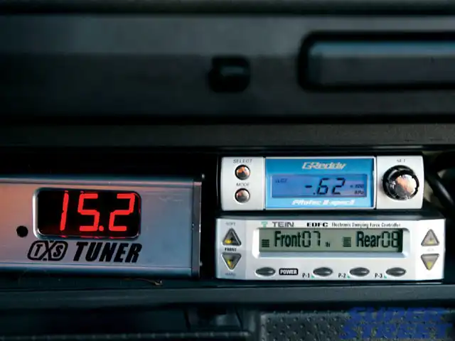 Дабы не отклоняться от намерения сохранить статус автомобиля на каждый день, Бруно пришлось придерживаться заводских настроек, хотя и не слишком строго. Он позвонил в Tein, и оттуда ему поставили комплект койловеров Super Street, менее жесткую модель из их популярной линейки, а так же контроллер EDFC для изменения настроек в случае необходимости. Регулируемый стабилизатор поперечной устойчивости Hotchkis и кронштейны Kinetix также дают возможность регулировать настройки подвески, а распорка передних стоек Richie обеспечивает кузову необходимую жесткость.