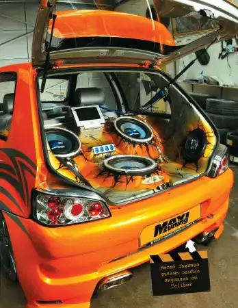 Шоу-кар, это автомобиль изначально задуманный как объект для демонстрации достижений фирмы, которая собственно и строит его. Зачастую ими являются, компании занимающиеся разработкой, продажей или инсталляцией всевозможных медиа-компонентов, но не в этот раз. Данный автомобиль был построен не для демонстрации новейших технологий на всяких эвентах, он был создан по заказу частного клиента, причем девушки. Ей хотелось владеть необычной, в тоже время яркой машинкой. Работу по доработке «Пыжа», она доверила студии SE Design, на счету у которых не один авторский проект. И глядя на автомобиль, можно смело сказать ее выбор был ненапрасным. Все выполнено по высшему разряду. Салон под завязку забит аудио «мульками». Вместо заднего сиденья расположились компоненты Caliber, видно инсталлятору больше всего по душе комплектующие данной фирмы. В центральную консоль имплантированы монитор Caliber и головное устройство Alpine.
