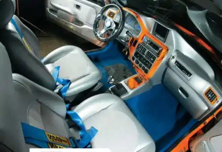 Под крутую музыку, и внешность должна быть соответствующей. Иначе просто бессмысленно устанавливать подобный «саунд». Спецы из SE Design знают все эти нюансы и в дополнении к мега инсталляции, изменили внешность до неузнаваемости. Для начала прикрутили хромированные, семнадцати дюймовые катки Status. Естественно в стандартные арки они вряд ли уместились бы, пришлось изготовить специальный wide body kit. Теперь передние крылье шире старых на 50 мм, а задние на целых 80. Если бы автомобиль использовался в сельской местности, то высокий клиренс был бы простителен, но автошка гоняет по городу, значит промежуток между кузовом и асфальтом должен быть минимальным. Эту ошибку исправил подвесочный кит от Bratex.