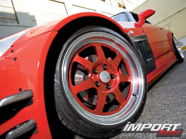 Когда весь обвес прибыл, Ким отвез его к Дэвиду в автомастерскую DTM Autobody, расположенную в Эль-Монте, чтобы все это подогнать и покрасить, включая окраску передней оптики в цвет кузова. При том количестве частей, требующих подбора цвета, разница между собственно подбором цвета и полной перекраской автомобиля в плане стоимости оказалась незначительной. Тем не менее, Ким решил оставить изначальный колер: «Лично мне кажется, что красный — это классический цвет спортивного авто. К тому же не так уж много я встречал грамотно построенных S2000 красного цвета». Расширенные крылья и арки потребовали расширения колесной базы. Вместо стоковых колес Майк заказал для Кима комплект дисков J-Line SL7 размерностью 17 на 8 спереди и 17 на 9,5 сзади. Обуты эти диски в резину Falken FK452 235/35 R17 и 215/40 R17 соответственно.
