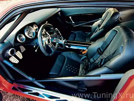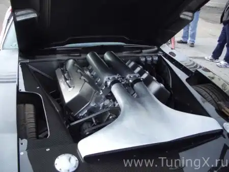 Купив старую «Барракуду» 1971 года в самой бедной комплектации, он полностью ее распотрошил. Затем были набросаны эскизы и 3D-рендеренги, машина стала существовать на бумаге, но ведь основное не идея, а ее воплощение. И работа началась с жестянки, которую резали, пилили, рехтавали и шкурили. В районе крыши и заднего стекла Алан отрезал все лишнее и приварил нужное, в том числе каркас безопасности в салоне. Увеличил колесную базу, опустил переднюю ось, затем прикрутил боковые выхлопные трубы необычной формы и сделал посадку Cuda очень низкой, чтоб она стелилась по дороге, как барракуда в водной гладе. И конечно самое сладкое — это сердце барракуды, которое тут просто ошеломляющее. Это полностью алюминиевый V8 572 HEMI, что значит восемь цилиндров и 9,3-литра объема. Этот невероятный монстр построен усилиями нескольких компаний: Indy Cylinder Head, Callies Crank, Eagle Rods и Wiseco Pistons. Моторище. «Хеми» выдает 870 л.с. мощности сам по себе, но Алан Джонсон снабдил мотор азотным нагнетателем Holley NOS (да бывает и такое), который впрыскивает еще три сотни «коней». Весь мотор находится в стильной карбоновой «коробке», которая спасает его от грязи, пыли и даже убережет при аварии. Соответственно, под такой 1170-сильный агрегат пришлось разжиться новой подвеской от Art Morrison, которая еще была доработана компанией JHRS. На выбор КПП повлияла также мощность машины, поэтому остановились на шестискоростной трансмиссии от Rockland Standard Gears, известной, как Tremec T-56, кторая готова «переваривать» более тысячи «лошадей». Так как машина может разогнаться до 320 км/ч, то поставили 15?? тормоза из титана компании Red.