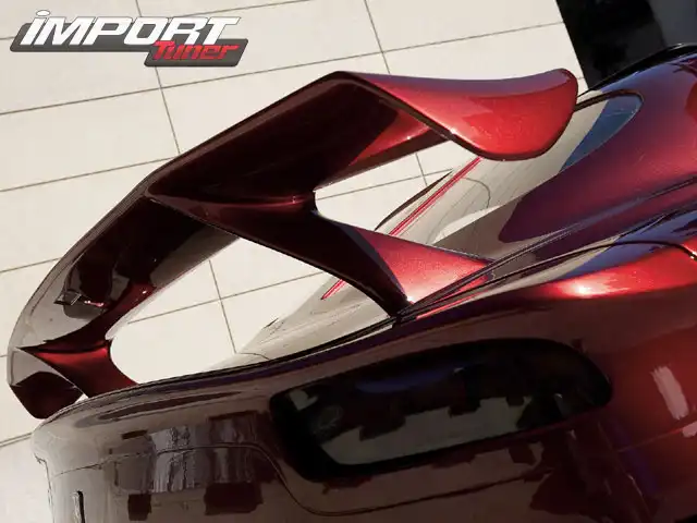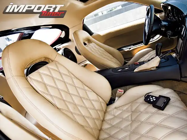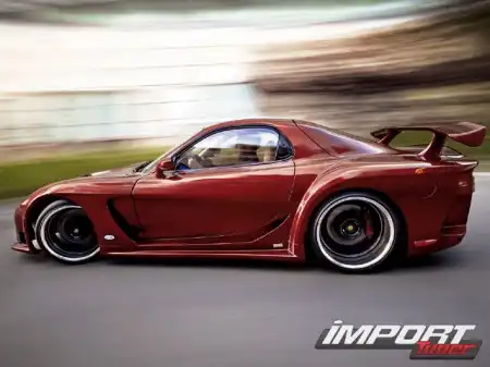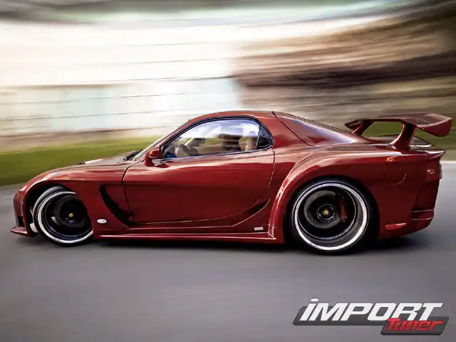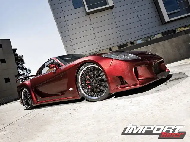 Установка комплекта обвеса из стекловолокна была трудной задачей, с которой с честью справились ребята из DTM Autobody в Эль-Монте, Калифорния. На все про все у них ушло пять долгих месяцев. Наконец, Мазда гордо явила всем новый шикарный расширяющий обвес винного цвета. Последним штрихом в деле выделения на фоне других RX-7 стала отделка салона кожей цвета Ferrari biscuit (светло-бежевая) с красной строчкой, гармонирующей с цветом карбонового торпедо.
