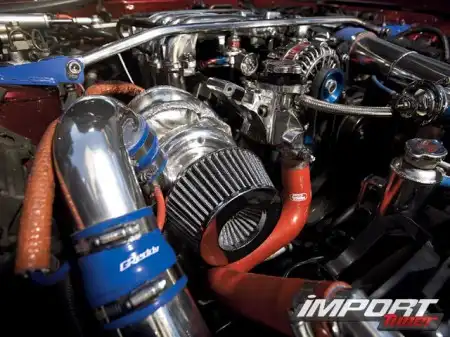 Получившийся в итоге 13В с отсечкой на 11 000 — это не что иное, как отличная возможность при неспешной езде сэкономить на топливе. Чтобы наполнить обе камеры сгорания сжатым воздухом, используется турбо-кит GReddy TD06. Сай подчеркивает, что основное преимущество этого турбо-кита не столько в количестве добавляемых «лошадок». Ведь главной причиной печальной известности турбовых роторных двигателей, склонных к закипанию, является избыточное тепло в двигательном отсеке. Установка одной турбины вместо двух стоковых секвентальных резко снижает количество выделяемого тепла, как и облегченный впускной коллектор из нержавеющей стали вместо массивного стокового из чугуна.