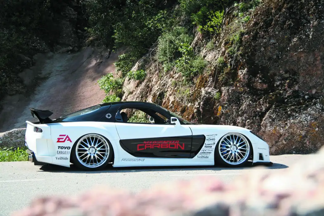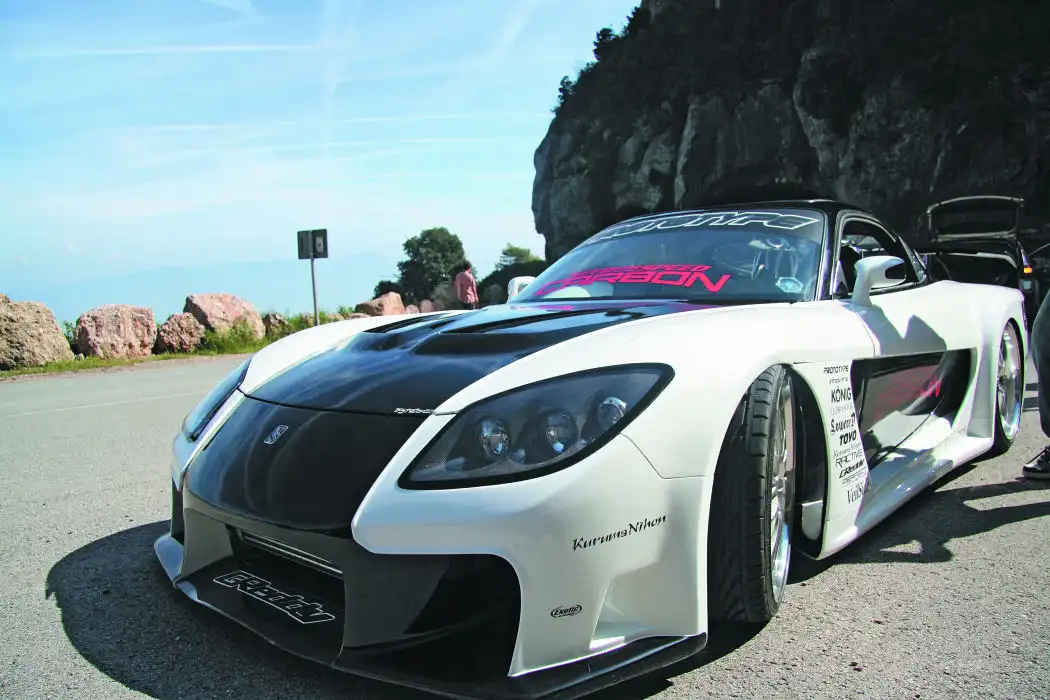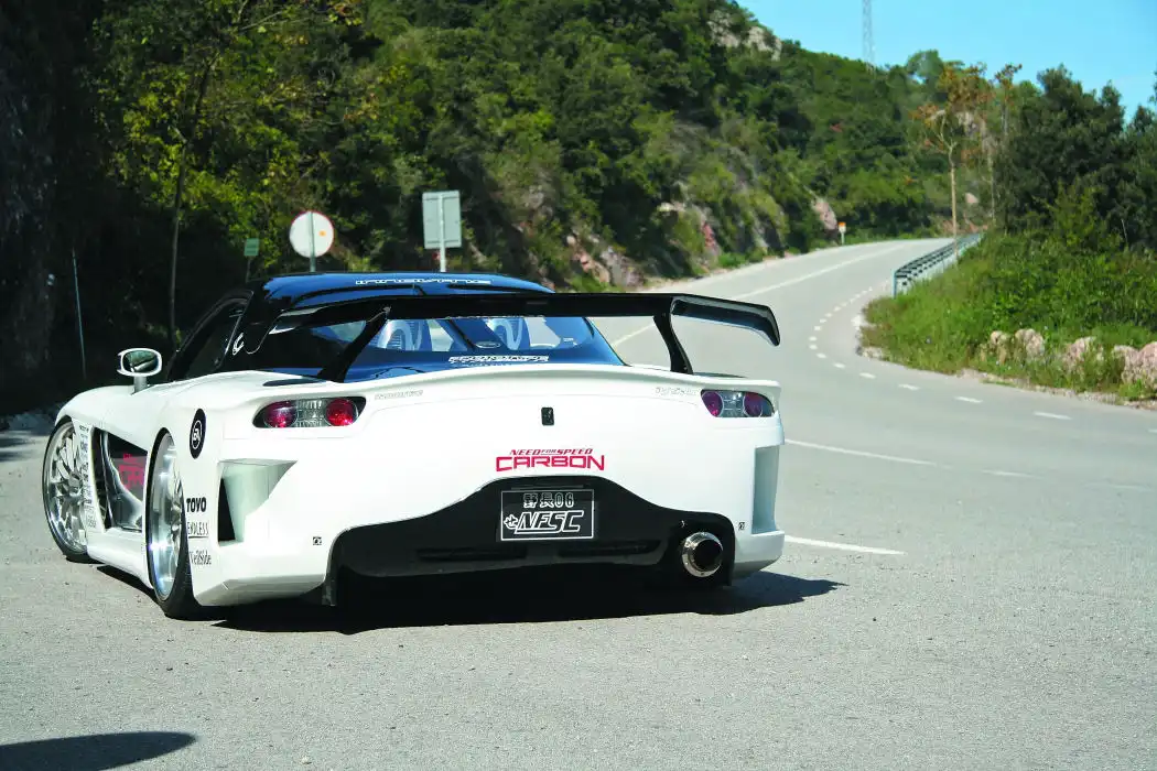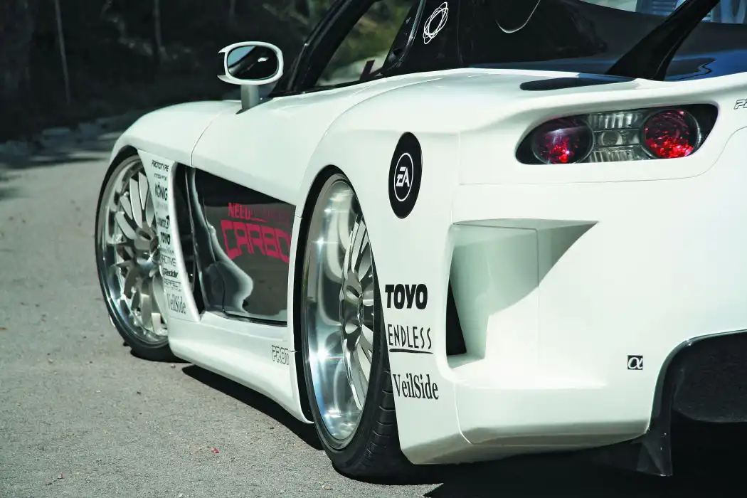 Сейчас RX-7 в любом другом обвесе смотрится, если честно, как-то бедновато и простенько. Разумеется, Prototype взяли для своего проекта Fortune, при этом немного его доработали и добавили пару «карбонятинок»: ручки да лючок бензобака. Проект не был бы испанским, если бы клиренс остался стандартным. Машину поставили на новую подвеску. Причем не как обычно – на пневматику, – а просто занизили клиренс до «минус бесконечности». При этом в арки влезли – держись – 20-дюймовые колеса! Но, конечно, не нигерские DUB’s, а настоящие гоночные Konig Netz.