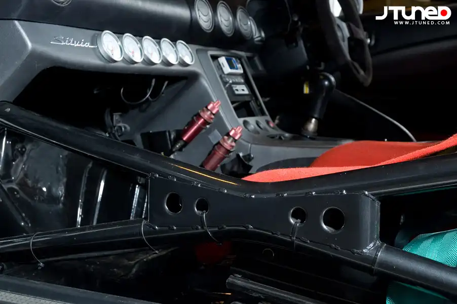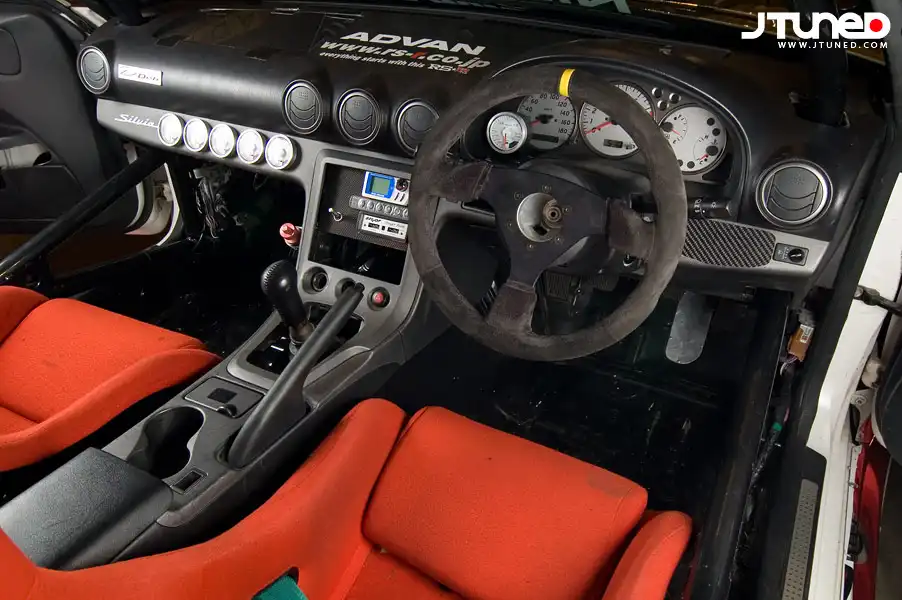 Вся эта мощь переносится на задний дифференциал гоночным сцеплением Ogura. 2-way дифференциалы повышенного трения от RS-R обеспечивают распределение тяги между задними колесами. RS-R Silvia S15 снабжена колесными дисками Enkei RPF1 (17x9 спереди и 18x10.5 сзади) и массивными шинами Advan Neova (245/40/17 спереди и 255/35/18 сзади). Феноменальное торможение было достигнуто благодаря колодкам Dorio от RS-R.